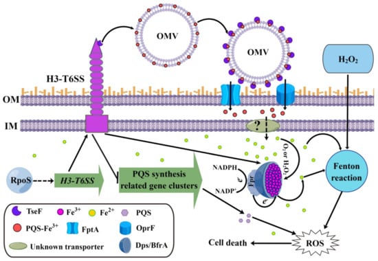 We demonstrated that H3-T6SS mediates the resistance of P. aeruginosa to H2O2 stress by reducing the intracellular free Fe2+ content and inhibiting the synthesis of PQS. Thus, we may ask, is H3-T6SS involved in changing the level of intracellular free Fe2+ in P. aeruginosa and then affecting the synthesis of PQS, or is it involved in affecting the synthesis of PQS and then further regulating intracellular free Fe2+ content through PQS? PQS can chelate iron, and a previous study demonstrated that the exogenous addition of 40 μM PQS caused an iron starvation response and significantly inhibited the expression of ferritin BfrB in P. aeruginosa PAO1 [36]. In addition, the expression of ferredoxin NADP oxidoreductase Fpr has been found to be inhibited by high concentrations of Fe3+ [58], while the expression of ferritins BfrB, BfrA, and Dps is induced by high concentrations of extracellular free Fe3+ [59,60,61]. Therefore, we propose that H3-T6SS inhibits the synthesis of PQS, reducing the extracellular PQS, increasing the concentration of extracellular free Fe3+ and thus inducing the expression of the iron storage proteins BfrA and Dps. BfrA and Dps convert intracellular Fe2+ to Fe3+ and store the Fe3+ via mineralization, reducing the content of intracellular free Fe2+ and thus enhancing the ability of P. aeruginosa to resist H2O2 stress. However, our results revealed that the expression of Dps was not affected by the addition of PQS or the deletion of the pqsH gene (data not shown). These results indicate that PQS cannot regulate the expression of Dps, implying that the inhibition of PQS synthesis and upregulation of Dps expression mediated by H3-T6SS independently affect the ability of P. aeruginosa to resist H2O2 stress.
