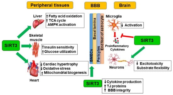 Although the main focus of this review is on the actions of SIRT3 in the brain, its effects in the peripheral tissues need to be discussed here because substrates for brain energy metabolism are generated in the periphery (Figure 1) [29,30]. SIRT3 deficiency-induced oxidative stress and inflammation at the systemic level can cause neuronal injury in the brain with circulating factors passing through the blood–brain barrier (BBB) [31]. In addition, comorbidities, including obesity, diabetes, and cardiovascular diseases often interact with AD pathogenesis and exacerbate it [32,33,34]. Several studies have demonstrated that brain lesions caused by comorbidities contribute to cognitive decline [35,36,37].