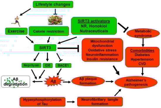 Protective effects of SIRT3 in Alzheimer’s disease: SIRT3 reduces the risk factors of Alzheimer’s pathogenesis by acting through multiple pathways. While SIRT3’s actions on alleviating mitochondrial dysfunction, oxidative stress, neuroinflammation, and insulin resistance are well known, recent studies are suggesting that it can also reduce amyloid plaque deposition by regulating the Aβ generation. We have recently demonstrated SIRT3-mediated decrease in BACE1, a key enzyme in the generation of Aβ peptide and increases in the levels of Aβ degrading enzymes, insulin degrading enzyme (IDE), and neprilysin. SIRT3 activators can ameliorate metabolic syndrome, the precondition for diabetes, hypertension, and cardiovascular diseases (CVD) which can coexist with Alzheimer’s disease. Protective actions are shown in green, and the pathways of disease progression are shown in red.