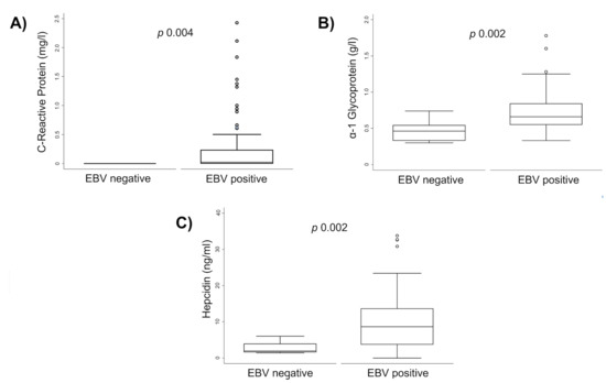 EBV infection is associated with enhanced levels of hepcidin and acute-phase protein in schoolchildren. Concentration of (A) C-Reactive protein, (B) α-1 Glycoprotein, and (C) hepcidin were measured in children and compared according to their EBV infection status using the Mann–Whitney’s test.