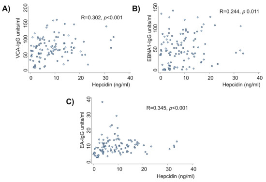 Hepcidin concentration positively correlates with the levels of EBV antibodies. (A) Viral capsid antigen (VCA), (B) EBV nuclear antigen 1 (EBNA1), and (C) early antigen (EA, also known as BMRF1) antibodies have a positive correlation with increased concentrations of hepcidin.