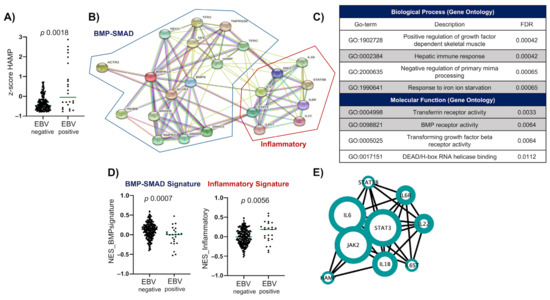 The association between EBVaGC and hepcidin (HAMP) led us to continue the analyses in this cohort of patients, aiming to identify the link between EBV and the regulatory mechanisms involved in the expression of HAMP. Previous studies have shown that hepcidin expression is regulated by at least two main pathways: the BMP–SMAD pathway that operates in response to high iron concentrations, and the JAK/STAT pathway that is active during acute and chronic inflammatory processes. We listed all the genes reported operating in these pathways and constructed a protein–protein interaction network (PPIN) to determine the involvement of each of the selected genes in the signaling pathways that regulate hepcidin expression. To perform this analysis, we used a list of genes documented in previous studies that includes ligands, receptors, modulators, and signaling intermediates of ligand–receptor pairs (see Supplementary Table S2 for the list of the relevant genes and their references). The PP1N of Figure 3B clearly shows the separation of both pathways, with HAMP remaining as central to both pathways. The constructed PPIN consisted of 24 nodes and 104 edges, with one cluster harboring the elements of a BMP–SMAD signature, and the other harboring elements of an inflammatory signature in which IL-1β, IL-6 and IL-22 cytokines were present. Moreover, within the main biological processes and molecular functions associated with the PPIN network, we found hepatic immune response, response to iron ion starvation, transferrin receptor activity, and BMP receptor activity, among others (Figure 3C).