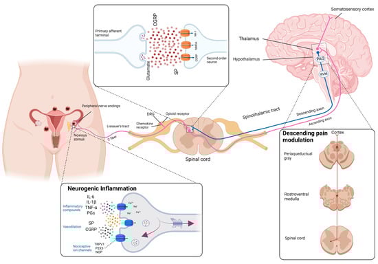 Pain and neurogenic inflammation in endometriosis. Endometriotic cytokines in the peritoneum, prostaglandins, interleukins (ILs), calcitonin gene-related peptide (CGRP), substance P (SP), nociceptive opioid peptide (NOP), and transient receptor potential vanilloid 1 (TRPV1) stimulate sensory peripheral nerve endings. The nociceptive signal conduct in the myelinated Aδ fibers or unmyelinated C fibers to the spinal cord. Subsequently, opioid peptides, which are synthesized as chemokine receptors, promote an antinociceptive effect in the dorsal root ganglia (DRG). In the DRG, chemokine receptors and opioid receptors receive the nociceptive message and transfer it to the spinal cord. Within the spinal cord, neurotransmitters such as CGRP, SP, and glutamate are released to activate the second-order neurons. Then, CGRP will combine with the CGRP receptor complex and SP will act on the neurokine-1 receptor (NK-1). The noxious message travels up to the thalamus via ascending axons and then finally reaches the somatosensory cortex. The nociceptive input can be attenuated or facilitated through endogenous opioid release via a descending pain-modulated system, which includes two crucial structures, periaqueductal gray (PAG) and rostroventral medulla (RVM).