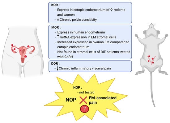 Even though the pathophysiology of EM-associated pain is not completely understood, strong pieces of evidence support that neurogenic inflammation may play a crucial role. As we discussed above, current treatment options are not the best choices for EM-associated pain as they not only interfere with ovulation but also are ineffective for all patients. Endogenous opioid peptides can be secreted from immunocytes, occupy peripheral opioid receptors on sensory nerve endings, and produce analgesia by inhibiting the excitability of these nerves or the release of pro-inflammatory neuropeptides. For several hundreds of years, opium has been used for pain relief, and nowadays, opioids remain a gold standard for the treatment of pain. In some cases, it is recognized that there is no substitute for opioids in achieving satisfactory pain relief. However, undesirable side effects following acute administration and long-term use limit their clinical effect. Additionally, the already observed risk of chronic opioid use and addiction in EM patients suggests that the pharmacological drugs available now are not the best option for these patients. More and more studies have suggested that multi-mechanistic opioids can be a valid alternative to traditional opioids for their safer profile. Particular interest has been paid to the role of the NOP receptor in terms of analgesia and improved tolerability. Emerging evidence has shown a promising functional profile of bifunctional NOP/MOP partial agonists as safe and nonaddictive analgesics [85,89,153]. While coactivation of NOP and MOP receptors may provide a viable treatment option for pain and drug abuse, caution is warranted for bifunctional NOP/MOP “full” agonists. NOP/MOP “partial” agonists provide considerable hope for the future of NOP-active compounds and the potential for opioid-type analgesics with reduced side effects and abuse liability. However, until now, the role of NOP receptors in EM has not been investigated. Therefore, this review offers a thought that still needs further investigation but may provide potential options for relieving EM-associated pain.