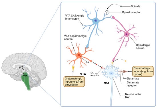 Opioid addiction involves the hijacking of the endogenous opioid system [129]. The neurocircuitry of this addiction involves three stages: the intoxication stage (opioid intoxication and incentive salience), the withdrawal affect stage (opioid tolerance and withdrawal), and the anticipation stage (opioid craving and relapse) [129]. In the intoxication stage, preclinical studies reported that the reinforcing effects of opioids are mediated in the ventral tegmental area (VTA) and nucleus accumbens (NAc) via not only dopamine-dependent but also drug-independent mechanisms [140] (Figure 3). Neurobiological mechanisms of tolerance range from opioid receptor desensitization and downregulation to cellular and circuitry allostasis [141,142]. The anticipation stage of the addiction cycle involves dysfunction of executive function. In humans, opioid addiction has a dysregulated hypothalamic–pituitary–adrenal stress axis; this dysregulation persists during cycles of addiction [143,144]. MORs, DORs, and KORs play different roles in the mechanisms of opioid addiction: MORs promote recreational drugs and adapt to chronic activation, which also leads to tolerance and dependence; KORs enable and sustain aversive states of withdrawal and abstinence; and DORs are involved in the improvement in mood states and facilitate context learning. All of them modulate motivation. Both MOR and KOR activities drive the onset, progression, and maintenance of an addiction. Nevertheless, the contribution of DORs remains less straightforward [145].