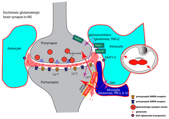 - TNFα regulates AMPA- and GABA- receptor trafficking in an antagonistic manner. The highly elevated levels of inflammatory cytokines released by activated microglia, astrocytes, and inflammatory CD3+ T-cells in MS, inhibit the expression of glial glutamate transporters (EAAT1/2), resulting in a decreased clearance of glutamate from the synaptic cleft [85,128,129,380,381,382,383,384,385] (Figure 3). The decreased glutamate clearance results in increased levels of extrasynaptic glutamate. Extrasynaptic glutamate binds to extrasynaptic glutamate receptors, including Ca2+-permeable NMDA receptors and Ca2+-permeable AMPA receptors. Stimulation of these extrasynaptic glutamate receptors is considered the central mechanism causing glutamate excitotoxicity, neurodegeneration, and neuronal cell death [386,387,388,389]. Many of these mechanisms involve elevated levels of Ca2+. Extrasynaptic NMDA receptor activation will trigger a deleterious signaling cascade that includes structural degeneration of the synapse, mitochondrial damage, and transcriptional shut-off of neuroprotective pathways [386,387,388,389]. Paradoxically, increased extrasynaptic glutamate can further inhibit the expression of astrocytic glutamate transporters [390], thus fostering a vicious cycle that leads to glutamate excitotoxicity.