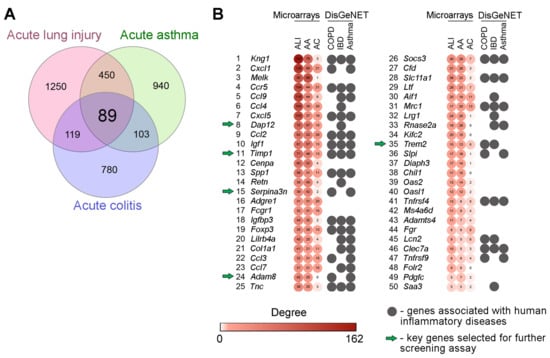Core genes associated with acute inflammation: results of bioinformatics analysis. (A) Venn diagram illustrating the overlap between differentially expressed genes (DEGs) in inflamed lung and colon tissue of mice with ALI (GSE94522), acute asthma (GSE122197) and acute colitis (GSE35609). (B) Heatmap demonstrating the interconnection of revealed core genes in gene association networks reconstructed for each explored cDNA microarray datasets using the STRING database (confidence score ≥ 0.7) and their involvement in human inflammatory diseases according to DisGeNET database. Degree: the number of gene partners of DEGs within the gene network. Top-50 the most interconnected hub genes are presented. ALI—acute lung injury; AA—acute asthma; AC—acute colitis; COPD—chronic obstructive pulmonary disease; IBD—inflammatory bowel disease.