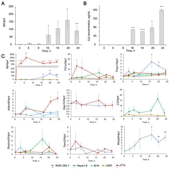 Upon LPS stimulation, RAW264.7 macrophages produce the inflammatory cytokines IL6 and, to a lesser extent, TNF-α (Figure 2). We have shown that the kinetics of Il6 activation includes two phases starting from moderate (2–14 folds, 3-6 h after LPS addition) activation, followed by a phase of intense activation (90–107 folds, 16–24 h after LPS addition). The mRNA level of Il6 positively correlates with the protein level assessed by ELISA (Figure 2). Another mouse macrophage cell line, J774, showed a huge 1300–4700-fold increase in Il6 mRNA expression levels without clear phase separation. This result complemented the previously obtained IL6 release data [80]. Thus, J774 cells showed an even more pronounced response to the inflammatory stimulus than RAW264.7. Hepa1-6 and B16 cells exhibited a less pronounced response to LPS induction; however, the expression level of Il6 increases 2–10 times with a maximum observed at 3 h. As we expected, no activation of Il6 mRNA expression was observed in L929 cells in response to LPS induction (Figure 2) since L929 cells were considered as cells insensible toward LPS stimulation.