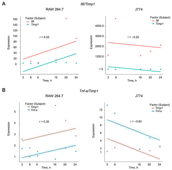 Thus, the most pronounced increase in the expression levels of the pro-inflammatory cytokines Il6 and Tnf-α was observed in macrophages and was accompanied by a significant activation of the expression of the Timp1 and Mmp9 genes. To confirm this observation, we calculated correlations between the expression levels of IL6, TNF-α, and TIMP1 in RAW 264.7 and J774 cell lines using rmcorr package in R [83]. Correlation analysis was visualized using the ggplot2 and ggbreak packages [84]. It appeared that RAW 264.7 cells were characterized by weak (r = 0.35) to moderate (r = 0.54) positive correlations in the case of TNF-α/Timp1 and Il6/Timp1 combination, respectively, while J774 cell line displayed a reverse trend of weak (r = −0.2) and moderate (r = −0.62) negative correlations in the case of Il6/Timp1 and TNF-α/Timp1 combination, respectively (Figure 3 and Supplementary Figure S2).