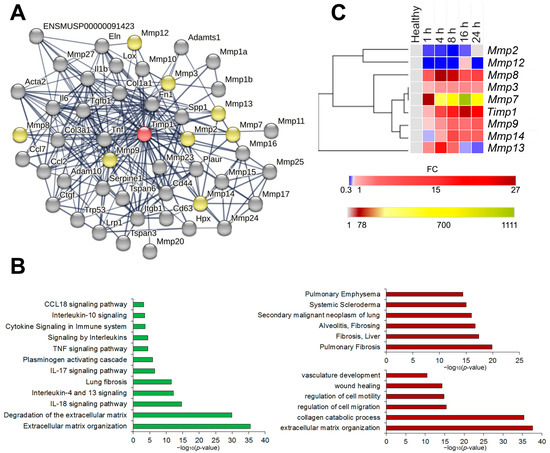 Identification, functional and expression analysis of Timp1 and its first neighbors. (A) Protein–proteins interaction network of Timp1 and its first neighbors reconstructed using the STRING database web-service. No more than 50 highest confidence first neighbors are shown; minimum confidence score of the interators > 0.700. The following interaction sources were used: text mining, experimental data, databases, co-expression, neighborhood, gene fusion and co-occurrence. Red colored node: query gene; yellow colored nodes: first shell interactors from MMP family; gray nodes: all other first shell interactors. (B) Histograms visualizing the functional enrichment analysis of Timp1 and its first neighbors. Functional enrichment analysis was performed through the ToppFun module of the ToppGene suite, using the MSigDB Biocarta (v.7.5.1), BioSystems: Reactome and KEGG, Panther DB (left panel), DisGeNET BeFree and DisGeNET curated (right upper panel) and Gene Ontology: biological processes (right lower panel) databases. For all enrichment tools, the input gene set was composed of the same 44 genes and default options were used: significance threshold of 0.05 for Bonferroni adjusted p-value, at least five genes from the input list in the enriched category, and the whole genome as background. (C) Dynamics of expression levels of Timp1 and interconnected Mmps in the lung tissue of mice with LPS-induced acute lung injury at different time points. Heat map construction was performed using Morpheus. FC = fold change.