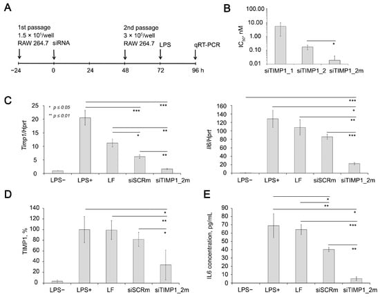 Silencing activity of anti-Timp1 siRNA in RAW 264.7 cells. (A) Experimental setup. (B) Calculated IC50 of silencing activity of anti-Timp1 siRNAs transfected using Lipofectamine 2000 in RAW 264.7 cells. The efficiency of Timp1 silencing was compared to the untreated cells. Four independent samples were measured in triplicates for each point. (C) Relative mRNA levels of Timp1 and Il6 in RAW 264.7 cells after LPS stimulation, transfection was carried out with Lipofectamine 2000. The level in control, non-treated cells was set as 1. The data represent the mean ± standard deviation from six or seven independent experiments analyzed in triplicates. (D) Relative TIMP1 protein level in RAW 264.7 cells 16 h after LPS stimulation, transfection was carried out with Lipofectamine 2000 4 days before measurement. The data represent the mean ± SD from three experiments. Representative Western blot image is presented at Supplementary Figure S3. Three independent samples were analyzed for each point. (E) Relative IL6 protein level in the culture medium of RAW 264.7 cells 16 h after LPS stimulation; transfection was carried out with Lipofectamine 2000 4 days before LPS stimulation. The data represent the mean ± SD from three experiments. Three independent samples were measured in duplicates for each point. * p ≤ 0.05, ** p ≤ 0.01, *** p ≤ 0.001, Student’s two-tailed unpaired t-test.
