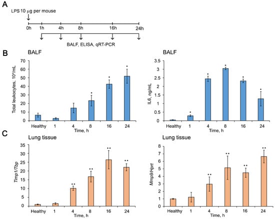 In order to evaluate the kinetics of Timp1 gene expression changes in the lung tissue during ALI, the murine model of LPS-induced ALI was used. Mice were subjected to intranasal (i.n.) administration of LPS (10 µg per mouse) followed by collecting bronchial alveolar lavage (BAL) fluid and lung tissue at 1, 4, 8, 16, and 24 h after induction (Figure 6A). Total leukocyte counting, ELISA and RT-qPCR analysis were performed (Figure 6).