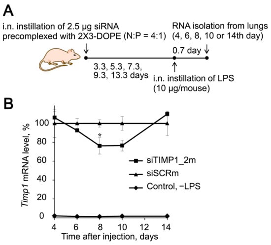 Then, we studied the kinetics of the changes in the Timp1 mRNA level in the lungs after i.n. administration of siTIMP1_2m pre-complexed with liposomes 2X3-DOPE followed by LPS challenge to validate the silencing activity of the selected siRNA in vivo (Figure 7A). The cationic liposomes 2X3-DOPE was chosen as the transfection agent for in vivo experiments, since its high transfection efficiency and low toxicity have been previously shown [94,95]. Time points of 4–14 days after siRNA administration and before LPS challenge were chosen based on the literature data and our previously obtained results [96]. As depicted in Figure 5B, siTIMP1_2m decreased the level of Timp1 by 25% 8–10 days after i.n. administration, then to 14th day the mRNA level restored to the level in siSCR-treated mice (Figure 7B). Based on these data, a time point of 8 days was chosen to study the effect of Timp1 mRNA silencing on the development of ALI in a mouse model.