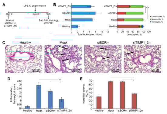 siTIMP1_2m effectively suppresses LPS-induced lung inflammation in vivo. (A) Experimental setup. Acute lung injury (ALI) was induced in mice (n = 6) by intranasal (i.n.) instillations of LPS (10 µg per mouse). Mice were pretreated with siTIMP1_2m administered i.n. 8 days before ALI induction. Mock and siSCR were used as controls. Mice were sacrificed 16 h after LPS challenge followed by collection of bronchoalveolar lavage (BAL) fluid and the lung tissue for subsequent analysis. (B) Total (left) and differential (right) leukocyte counts in the BAL fluid of healthy and LPS-challenged mice without treatment and after siTIMP1 administration. Four BAL samples from each experimental group were analyzed. (C) Representative histological images of lung tissue of ALI mice without treatment and after siTIMP1_2m administration. Haematoxylin and eosin staining. Original magnification ×200. Black arrows indicate inflammatory infiltration in the lung tissue. (D,E) The intensity of inflammatory infiltration quantified by the histological scoring system (D) and the volume density of interstitial edema (E) in the lung tissue of LPS-challenged mice without treatment and after siTIMP1 administration. The inflammatory scores and interstitial edema were calculated in 5 random fields in each lung sample, forming 30 random fields from each experimental group. Data are presented as mean ± standard deviation. * p ≤ 0.05, ** p ≤ 0.01, Mann–Whitney U-test.