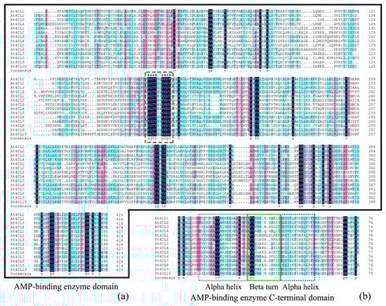 4CL gene family domains in Arabidopsis and potato were used to multiple sequence alignment. (a) The AMP-binding enzyme domain amino acid sequences were aligned. The dashed boxes were conserved amino acid sequences. “*” were conserved amino acids in the AMP-binding enzyme domain. (b) The AMP-binding enzyme C-terminal domain amino acid sequences were aligned. The solid boxes were amino acid sequences corresponding to the Beta turn, and dashed boxes were amino acid sequences corresponding to the Alpha helices.