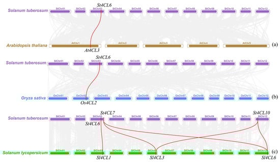 4CL genes in rice (Oryza sativa), potato (Solanum tuberosum), Arabidopsis thaliana and tomato (Solanum lycopersicum) were analyzed for collinearity. (a) 4CL genes in potato and Arabidopsis were analyzed for collinearity. (b) 4CL genes in potato and rice were analyzed for collinearity. (c) 4CL genes in potato and tomato were analyzed for collinearity. Gray lines represent regions where collinearity exists between rice, potato, Arabidopsis and tomato. The red lines were used to connect genes for which collinearity existed between rice, potato, Arabidopsis, and tomato.