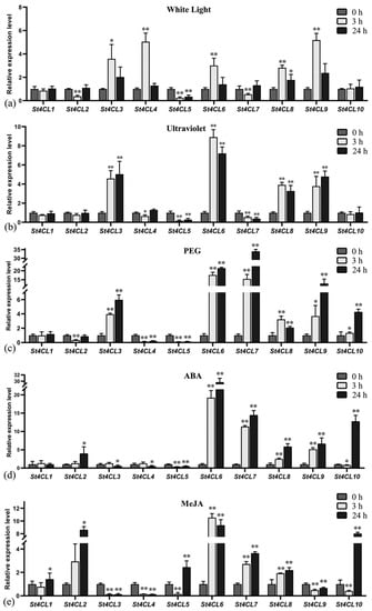 Decreased gene expression was also seen in the St4CL gene family in different treatments. St4CL2 and St4CL7 showed a significant decrease in expression at 3 h of white light treatment, but the expression of these genes became indistinguishable when subjected to continuous light for 24 h compared with that without white light treatment (Figure 8a). St4CL5 appeared as a negatively regulated gene in response to white light treatment, with expression 0.24-fold and 0.34-fold of control (light treatment for 0 h) after 3 h and 24 h of continuous white light treatment, respectively. The gene expression of both St4CL5 and St4CL7 appeared to significant decrease after UV irradiation, in which St4CL5 was only 0.16-fold of the control after 3 h of UV treatment (Figure 8b). Both St4CL4 and St4CL5 showed significant decreases in expression when treated with PEG, and similarly St4CL4 and St4CL5 showed decreased gene expression under ABA treatment (Figure 8c,d). When treated with MeJA, gene expression of St4CL3, St4CL4, and St4CL9 decreased significantly, which indicated that St4CL3, St4CL4, and St4CL9 were involved in negative regulation of MeJA signal response in potatoes (Figure 8e).