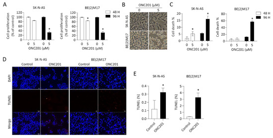 We further evaluated cell viability by trypan blue staining using flow cytometry analysis as well as TUNEL assay. Consistent with the previous results of cell growth inhibition, the percentage of trypan-blue-positive cells was less significant at 48 h of treatment with ONC201, but more significant at 96 h in both SK-N-AS and BE(2)M17 NB cells (Figure 2C).