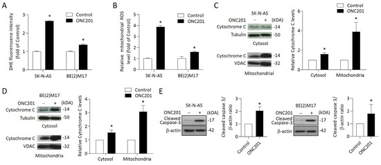 Effects of ONC201 on mitochondria-mediated apoptosis signaling in NB cells: (A) The intracellular ROS production of ONC201-treated cells was detected by DHE staining. The relative intensity of DHE fluorescence was analyzed by flow cytometry. (B) Mitochondrial ROS was detected by MitoSOX Red and immediately analyzed by flow cytometry. Data are expressed as fold change compared with control group. (C,D) To detect cytochrome C release, cytosolic and mitochondrial fractions of NB cells were subjected into 15% SDS-PAGE and probed with anti-cytochrome c antibody by Western blot analysis. Alpha-tubulin and VDAC1 were used as the cytosolic and mitochondrial internal control, respectively. (E) The protein levels of cleaved caspase 3 were detected by Western blot. The relative protein ratio was normalized with β-actin using Image Pro-plus analysis software. All data were obtained from three independent experiments, and are expressed as mean ± SD. * p < 0.05.