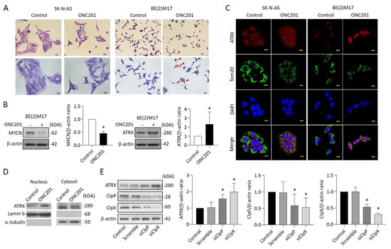 Effects of ONC201 on neurite outgrowth and the express profiles of ATRX in NB cells: (A) Representative of Giemsa staining in ONC201-treated SK-N-AS and BE(2)M17 cells. Scale bar 20 μm (upper panel) and 10 μm (lower panel), respectively. Red arrow indicates the neurite extension. (B) Western blot analysis of MYCN and ATRX protein in ONC201-treated BE(2)M17 cells. The relative protein ratio was normalized with β-actin using Image Pro-plus analysis software. (C) Representative images demonstrating ATRX enhancement (red) in the nucleus of SK-N-AS and BE(2)M17 cells when exposed to ONC201 (5 μM) for 48 h. The mitochondria were labeled with anti-TOM20 antibody (green). The nuclei were labeled with DAPI (blue). Scale bar 10 µm. (D) Western blot analysis of ATRX protein in nuclear and cytosolic fractions in BE(2)M17 cells. The relative ATRX ratio was normalized with lamin b and alpha-tubulin, respectively, and expressed as mean ± SD. (E) Analysis of ATRX expression in siClpP- and siClpX-treated SK-N-AS cells by Western blot. The relative protein ratio was normalized with β-actin, and is expressed as mean ± SD. All data were obtained from four to six independent experiments. * p < 0.05.