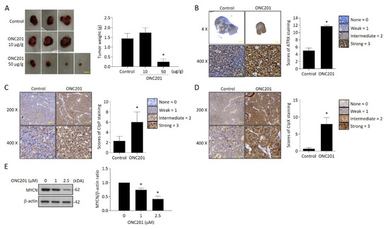Next, we evaluated the therapeutic efficacy of ONC201 in a xenograft NB animal model. Administration of ONC201 (50 μg/g) significantly inhibited the tumor growth. Compared to the control group, the tumor weight of ONC201-treated group (0.28 ± 0.27 g) decreased down to only around 20% of the control group (1.44 ± 0.45 g) (Figure 6A). Further immunohistochemistry analysis demonstrated a significantly higher percentage of nuclear ATRX-positive cells in ONC201-treated NB tissues than the control group (Figure 6B). Interestingly, the immunoreactive ClpP and ClpX protein staining was also significantly increased in the high-dose group, indicating that the administration of ONC201 (50 μg/g) for a longer period may reverse the decreased protein expression of both ClpP and ClpX in the in vitro studies (Figure 6C,D). We also verified the effect of ONC201 on MYCN expression in MYCN-amplified NB cells. Surprisingly, the ONC201 treatment suppressed the expression of MYCN in BE(2)M17 cells in a dose-dependent manner (Figure 6E).