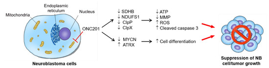 The dysregulation of mitochondria, suppression of MYCN, reactivation of ATRX, and the implication of ClpP and ClpX in differentiation are key processes involved in the particular process of ONC201 treatment in NB cells. ONC201, as a single-agent therapy, can suppress MYCN-amplified NB xenograft growth. Future therapeutic application in NB, in combination with other agents, is promising. The major finding of our study is summarized and illustrated in Figure 7.