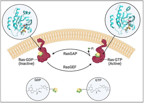 Schematic of the Ras switching cycle. Ras cycles between the GTP-bound active state and the GDP-bound inactive state. RasGAP catalyzes the hydrolysis of GTP, and RasGEF facilitates guanine nucleotide exchange. Created with BioRender.com.