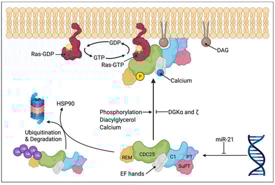 Ding and colleagues identified RasGRP1 to be a client protein of the chaperone heat shock protein 90 (HSP90) (Figure 3). Additionally, the degradation of RasGRP1 can be mediated by HSP90 acetylation [46]. There is emerging evidence that microRNAs also play a role in the RasGRP1 expression; specifically, miR-21 was shown to suppress the expression of RasGRP1 [47,48]. Conversely, the downregulation of miR-21 increased the RasGRP1 expression in vitro [49].