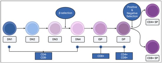 CD4 and CD8 expression of thymocytes through maturation. Immature thymocytes begin the process of maturation in the thymus in the double negative (DN; CD4− CD8−) stage, followed by DN2, DN3, and DN4 stages. The process of β-selection takes place as DN3 thymocytes mature into the DN4 stage. In mice, DN4 thymocytes transition through an immature single positive (ISP, CD8+) stage to become double positive (DP; CD4+ CD8+) thymocytes. The second round of selection, positive and negative selection, takes place between the DP and the mature single positive (SP) stages. Mature SP thymocytes can be CD4+ or CD8+. Created with BioRender.com.
