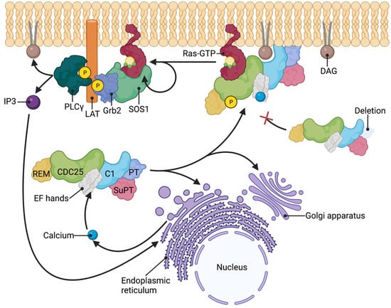 Adjacent to the catalytic module of RasGRP1 is a pair of EF hands (Figure 2) with a calcium-binding capacity in vitro [11]. The evidence is conflicted on the importance of EF hands and calcium for the activation of RasGRP1. Some studies found the EF hands and calcium to be dispensable [12,13,14], while some found them to be necessary [15]. The current weight of evidence supports the idea that the EF hands do indeed bind calcium, induce conformational changes, and activate RasGRP1 [16,17]. The calcium source is from the endoplasmic reticulum stores, and its release is mediated by phospholipase C-γ-generated inositol-1,4,5-trisphosphate (IP3) [18].