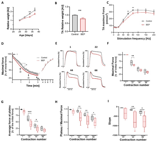 Next, we evaluated muscle fatigability by repetitive tetanic contraction of the TA muscle over 3 min. We plotted the maximal isometric force, normalized to the initial force, in the function of time. We observed increased fatigability of rats in the BEP group, which was more evident and statistically significant around the first minute of the protocol (Figure 1D). We observed that the profile of consequent tetanic contractions varied during the fatigue protocol, especially in the BEP group. To illustrate this observation, we sampled four specific contractions along the 3 min of repetitive stimulation (contraction N° 1, 22, 44, and 66). Then, we escalated them to 100% peak force to compare the profile between the groups (Figure 1E). Comparing these escalated profiles, we observed a decline in muscle force during the tetanic contraction, which was more pronounced while more advanced in the protocol (intratetanic fatigue). Furthermore, we observed that the intratetanic force decline was more significant in the BEP group than in control rats. Hence, although the maximal force was not relatively different between control and BEP rats (only in contraction N° 22) (Figure 1F), the average force in the final plateau was significatively lower in the BEP group (Figure 1G). Furthermore, the ratio between the plateau and maximal strength also decreased in BEP-treated rats compared to controls (Figure 1H), with a more pronounced downfall slope (Figure 1I), suggesting that intratetanic muscle force decayed more, and faster, after each contraction.