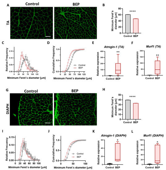 A possible mechanism related to decreased muscle force and increased fatigability is muscle waste or atrophy. Alcoholic myopathy is characterized by atrophy, predominantly of fast type 2 glycolytic fibers and type 1 oxidative fibers [19,20,31]. Furthermore, skeletal muscle atrophy is a hallmark of neurodegenerative conditions affecting motor neurons and diseases like cachexia, sarcopenia, and muscle denervation [32,33,34,35,36]. As mentioned before, we observed decreased muscle mass of TA (the muscle in which we measured contractile function) from BEP-treated rats (Figure 1B). We performed basic histology staining (H&E), and we did not find evidence of necrotic foci or central nuclei in muscles from BEP treated rats (Supplementary Materials Figure S2). To evaluate possible muscle atrophy, we used a fluorescent probe (wheat germ agglutinin, WGA) to label cell surfaces in muscle cross-sections [37] and to estimate muscle fiber size. We observed smaller-sized fibers in TA from BEP-treated (Figure 2A), and we evaluated differences in the fiber cross-sectional area by determining the minimum Feret’s diameter. We found that the average fiber size in TA muscles from BEP-treated rats was reduced, compared to controls (Figure 2B). Furthermore, the distribution profile, relative and cumulative, presented a curve displaced to the left with a higher proportion of smaller diameters than the control animals (Figure 2C,D). The reduction in minimum Feret’s diameter was also observed in diaphragm (DIAPH) (Figure 2G–J) and extensor digitorum longus (EDL) muscles (Supplementary Materials Figure S3) of BEP-treated rats.