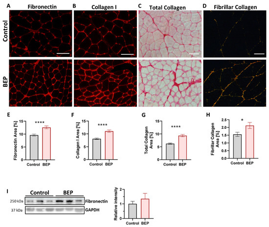 Skeletal muscle fibrosis is the excessive accumulation of extracellular matrix (ECM) proteins around muscle fibers, negatively impacting muscle contractibility, cellular signaling, vascularization, and innervation, among others [49,50,51]. Fibrosis is characteristic of many neuromuscular pathologies of different etiologies, usually directly proportional to disease severity [49,52,53,54]. Thus, the establishment of fibrosis is usually a sign of chronic muscle damage. Therefore, we evaluated if BEP was able to induce a fibrotic process that was still evident two weeks after the last ethanol administration. We used transversal cryosections of skeletal muscle to evaluate levels of ECM proteins, fibronectin, an excellent marker of skeletal muscle fibrosis [36,37,55], and collagen I, by immuno-staining and total collagen using picrosirius-red staining. Fibrillar collagen was evaluated by observing picrosirius-red-stained slides under polarized light [56]. We found that the TA muscle from BEP-treated rats had an augmented accumulation of fibronectin (Figure 3A,E), collagen I (Figure 3B,F), total collagen (Figure 3C,G), and fibrillar collagen (Figure 3D,H), compared to control individuals. The increased levels of fibronectin in TA from BEP-treated rats were also observed using western blot from protein extracts from TA samples, yet we obtained high variability in those samples (Figure 3I). The accumulation of ECM proteins was also evaluated in DIAPH, because DIAPH muscle has been shown to be especially susceptible to fibrosis, more so than other limb muscles, in murine models for neuromuscular diseases [57,58,59]. We found that the increment in ECM accumulation after BEP was also observed in DIAPH (Supplementary Materials Figure S6) and other hindlimb muscles different from TA (Supplementary Materials Figure S7).