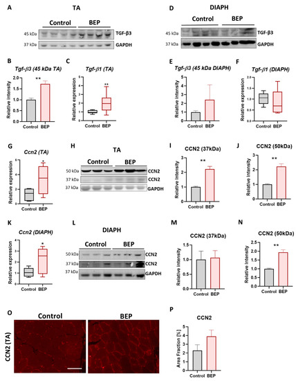 Cellular Communication Network Factor 2 (CCN2, also called Connective Tissue Growth Factor CTGF), is a potent profibrotic factor in skeletal muscle and other tissues and a downstream target of Transforming Growth Factor β (TGF-β) signaling [49,60,61,62]. We evaluated Tgf-β mRNA levels in total muscle RNA extracts from BEP and control rats and found significantly increased expression of Tgf-β transcripts in TA muscles but not in DIAPH (Figure 4C,F). We also observed increased levels of TGF-β3 45 kDa latent peptide in TA muscles (Figure 4A,B) but not in DIAPH (Figure 4D,E). Furthermore, we found increased expression of Ccn2/Ctgf mRNA in both TA and DIAPH (Figure 4G,K) from BEP-treated rats. Then, we evaluated CCN2/CTGF protein levels by western blot, and we found increased levels in the described 37 kDa band for CCN2/CTGF in TA (Figure 4H,I). In addition, we found significantly increased levels of a 50 kDa CCN2/CTGF band in BEP-treated rats compared to control animals, in both TA (Figure 4H,J) and DIAPH (Figure 4L,N). Immunostaining of transversal cryosections of TA muscle also indicated increased levels of CCN2/CTGF from BEP-treated rats (Figure 4O,P).