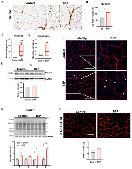 Binge-like ethanol protocol increased skeletal muscle pathological markers. (A) Representative images of TA immunohistochemistry using anti-Rat IgG antibody. Scale bar 100 µm. (B) Quantification of IgG staining as a percentage of occupied area fraction. (C,D) Relative expression of Nf-kb mRNA in TA ((C), control N = 3, BEP N = 4) and DIAPH ((D), control N = 3, BEP N = 3). (E) Immunoblot against nNOSµ and GAPDH as a loading control on TA muscle. Densitometric analysis performed with control N = 4, BEP N = 4. (F) Representative images of TA immunofluorescence using an anti-nNOSµ antibody (red) and Hoescht (blue) to stain nuclei. Asterisks indicate fibers with nNOSµ lost from the sarcolemma. Scale Bar 100 µm (G). Immunoblot against nTyr, with GAPDH as a loading control on DIAPH muscle and the respective densitometric analysis of bands A, B, C, D. Control N = 3, BEP N = 4. (H) Representative images of TA immunofluorescence using anti-8-OHdG antibody. Scale bar 100 µm. Quantification of 8-OHdG as a percentage of occupied area fraction. Control N = 3, BEP N = 4. p-values: * p ≤ 0.05; ** p ≤ 0.01; *** p ≤ 0.001.