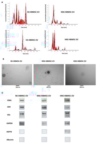 NS, NNS, HS, and HNS HBMSC-EV Characterization. Characterization was done with (A) NTA, (B) electron microscopy, and (C) Western blot. CD81, CD9, Alix, and GAPDH were identified in the NS, NNS, and HNS HBMSC-EV types. HSP70 was only identified in HNS HBMSC-EV. Albumin was not identified in any of the HBMSC-EV types, the absence of which is a marker of sample purity. Western blot was used to only qualitatively identify the presence of known HBMSC-EV markers and no statistical analysis or comparisons were performed between HBMSC-EV types. Western blot bands are displayed separately, given the need for wide-ranging exposure times. Given the extremely low protein content of HS HBMSC-EV, electron microscopy and Western blot characterization were not able to detect this HBMSC-EV. Each experiment was performed in triplicates using three independently isolated EV samples (n = 3).