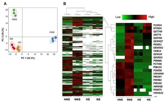 Proteomic analysis demonstrated qualitative and quantitative differences in HBMSC-EV protein content when the HBMSC were not exposed to starvation pre-conditioning. (A) Principal component analysis (PCA) of normalized total protein abundance (peak area) of the HBMSC-EV subtypes showed that the protein signatures of the NS (normoxia starvation) and HS (hypoxia starvation) subtypes were similar, while the rich media HBMSC-EV subtypes exposed to normoxia (NNS) and hypoxia (HNS) were significantly different from each other. (B) Heat map clustering of the total proteins identified and quantified proteins shows differential abundance among the four HMBSC-EV subtypes that had a distinct enrichment pattern.