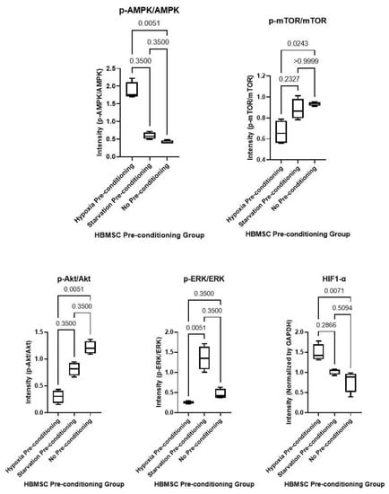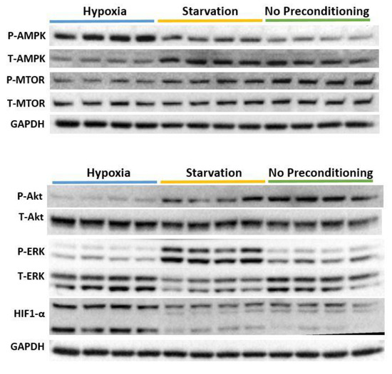 Western blot analyses of HBMSC after either hypoxia (n = 4) or starvation (n = 4) pre-conditioning showed that hypoxia and starvation pre-conditioning significantly modulated major stress response and proliferative pathways compared to cells under normoxic non-starved (n = 4) conditions. HIF1-alpha expression was significantly increased after hypoxia pre-conditioning.