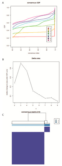 - Wilkerson, M.D.; Hayes, D.N. ConsensusClusterPlus: A class discovery tool with confidence assessments and item tracking. Bioinformatics 2010, 26, 1572–1573. [Google Scholar] [CrossRef] [PubMed]