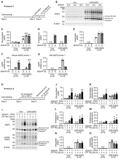 Semiquantitative immunoblotting and real-time quantitative PCR of AQP2 and phosphorylated AQP2 at serine 256 (pS256-AQP2) in control mpkCCDc14 cells and V2R-AQP2 cells. (A) Experimental design for dDAVP stimulation (Protocol 1, Panels A–G). After starvation for 24 h, 10−9 M dDAVP was applied to the basolateral side of the cells in the transwell chamber for 0 h, 3 h, or 6 h. (B–E) Semiquantitative immunoblotting of AQP2 in total cell lysates of control mpkCCDc14 cells and V2R-AQP2 cells treated with dDAVP as in Protocol 1. n = 3 in each group. (F,G) Real-time quantitative PCR with primers specific for mouse- or rat-Aqp2 mRNA in control mpkCCDc14 cells and V2R-AQP2 cells treated with dDAVP as in Protocol 1. n = 3 in each group. * p < 0.05 compared with 0 h of control mpkCCDc14 cells. # p < 0.05 compared with 3 h of control mpkCCDc14 cells. $ p < 0.05 compared with 6 h of control mpkCCDc14 cells. † p < 0.05 compared with 0 h of V2R-AQP2 cells. ‡ p < 0.05 compared with 3 h of V2R-AQP2 cells. (H) Experimental design for dDAVP stimulation (Protocol 2, Panels H–O). For induction of AQP2 expression, cells were treated with 10−9 M dDAVP to the basolateral side for 1 day or 2 days. After that, dDAVP was withdrawn for 2 h and then cells were treated again for 30 min. (I–O) Immunoblotting of AQP2 and pS256-AQP2 in control mpkCCDc14 cells and V2R-AQP2 cells treated with dDAVP as in Protocol 2. * p < 0.05 compared with control mpkCCDc14 cells (day 0, 30 m−). # p < 0.05 compared with control mpkCCDc14 cells (day 0, 30 m+). $ p < 0.05 compared with V2R-AQP2 cells (day 0, 30 m−).