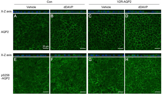 Immunocytochemistry of AQP2 was performed to examine the homogeneity of AQP2 expression as well as AQP2 translocation to the plasma membrane in the absence or the presence of dDAVP treatment. dDAVP (10−9 M) was applied to the basolateral side for 30 min without a period of dDAVP-mediated AQP2 induction. The relative intensity of AQP2 labeling was more prominent in V2R-AQP2 cells than in control mpkCCDc14 cells in the absence of dDAVP (Figure 4C vs. Figure 4A), indicating the constitutive expression of integrated AQP2 in V2R-AQP2 cells, as demonstrated in Figure 3B. Moreover, AQP2 immunolabeling was more homogenous in V2R-AQP2 cells compared with control mpkCCDc14 cells (Figure 4C vs. Figure 4A), indicating the homogenous expression of integrated AQP2 in V2R-AQP2 cells. Furthermore, prominent AQP2 immunolabeling in the apical domain of the genome-edited cells was observed in response to dDAVP stimulation, similar to that in the unedited control mpkCCDc14 cells (Figure 4D vs. Figure 4B). Consistent with AQP2 immunolabeling, the relative intensity of pS256-AQP2 labeling was more prominent in V2R-AQP2 cells than in control mpkCCDc14 cells in the absence of dDAVP (Figure 4E vs. Figure 4G). dDAVP stimulation induced prominent of pS256-AQP2 immunolabeling in the plasma membrane, similar level in both cell types, as observed in the x-z images (Figure 4F vs. Figure 4H and x-z image). The finding indicated that mpkCCDc14 cells constitutively expressing V2R and AQP2 via genome engineering could be exploited for AQP2 trafficking studies.