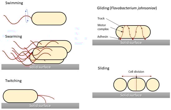 Graphical presentation of five bacterial movement types. Structures responsible for generating bacterial movement are marked in red. Sliding motility is presented for Flavobacterium johnsoniae as a model for this type of motility, although for other bacteria (i.e., Myxococcus xanthus) there are differences in the cell propulsion mechanism. The figure was prepared based on the data and figures presented in [31].
