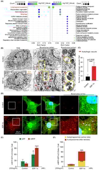 To explore the effect of SDF-1α on chondrocytes, we performed RNA sequencing. Biological process (BP) based on Gene Ontology (GO) enrichment analysis showed that autophagy-related gene expression profiles significantly upregulated after treatment with SDF-1α. At the same time, we noticed that mitophagy-related genes were also increased. This suggests that the effect of SDF-1α on chondrocyte autophagy may involve selective autophagy, which provides directions for our future research. To confirm the RNA sequencing results, we examined the autophagy phenotype. TEM assays were performed to detect the number of autophagic vacuoles in chondrocytes with or without SDF-1α treatment. The results showed that the stimulation of SDF-1α could increase the formation of autophagic vacuoles. It is worth noting that not all autophagic vacuoles in the TEM assay exhibit the double-membrane structure. However, combined with the morphology of vesicle contents, it is believed that autophagy progression might have been in the middle and/or late stages. At this stage, autophagic vacuoles or autolysosomes contain only one limiting membrane [53,54].