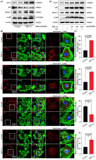 SDF-1α is the most common isoform of stromal cell-derived factor 1 [4,37]. At the same time, SDF-1α is widely distributed and plays essential roles in cell proliferation [5], migration [38], differentiation [7] and organ development [39]. Previous studies have shown that SDF-1 could potentially regulate autophagy in stem cells [40] and cancer cells [9,41,42,43]. However, these results from different cell types are not only controversial but also unclear about the actual internal mechanism. A general consensus is that SDF-1 might be a vital target for autophagy. Autophagy is a highly conserved biological process often activated under stress conditions. Through degrading and recycling intracellular components, autophagy helps cells survive in harsh environments [44]. Furthermore, cells deal with errors such as misfolded or unfolded proteins by autophagy in normal conditions. In recent years, studies have demonstrated that autophagy is related to many pathogeneses of degenerative diseases such as osteoarthritis, Alzheimer’s disease and Parkinson’s disease [45,46,47]. Therefore, the regulation of autophagy may become more clinically significant, and may provide related therapeutic targets based on autophagy.