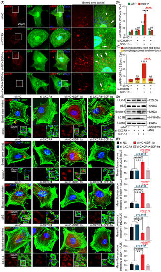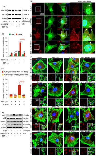 Experiments were independently repeated at least in triplicate (n ≥ 3). Specifically, we randomly analyzed cells (12–15 cell for immunofluorescence, 3–5 cells for mRFP-GFP-LC3 adenovirus double label assay and 3 cells for TEM assay) per group from three independent experiments, and obtained the three average data from three independent experiments, respectively. We then made statistical difference analysis about these average data between control group and SDF-1α group. Differences among groups were statistically analyzed by one-way analysis of variance and Student t-test. Data are presented as the mean ± standard deviation (SD) and plotted with GraphPad Prism 8 software. Only with p value < 0.05 is the difference considered to be statistically significant.