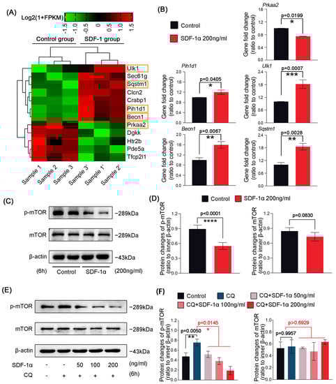 To check the specific change of gene candidates in autophagy-related biological processes of GO enrichment in Figure 1A, we screened RNA sequencing data and clustered a pheatmap by online R-package (Figure 4A and Table S3). Among these candidates, we found that genes such as autophagy activating kinase 1 (Ulk1), beclin 1 (Becn1) and sequestosome 1 (Sqstm1), which are typically responsible for autophagy [30,31,32], were all upregulated. At the same time, we also found that genes such as PIH1 domain containing 1 (Pih1d1) and 5′-AMP-activated protein kinase catalytic subunit alpha-2 (Prkaa2), which are directly related to mTOR signaling [33,34], were changed. The qPCR results further confirmed the change in these major representative genes (Figure 4B). As the above data show, mTOR signaling, which promotes biomolecule synthesis and simultaneously inhibits autophagy [35], might be involved in chondrocyte autophagy induced by SDF-1α. Thus, we performed western blots to check the protein change of mTOR signaling (Figure 4C). The results show that the total expression of mTOR was not changed, but the phosphorylation of mTOR was significantly decreased in chondrocytes with the treatment of SDF-1α at 200 ng/mL for 6 h (Figure 4C,D). These results suggest that the effect of SDF-1α on the mTOR signaling pathway might be a post-translational modification. By using autophagy inhibitor CQ (20 μM), we first found the upregulation of p-mTOR signaling in normal chondrocytes, however, its expression was sharply decreased in chondrocytes in the presence of SDF-1α at 200 ng/mL for 6 h (Figure 4E,F). At the same time, the protein expression of p-mTOR decreased in a dose-dependent manner induced by SDF-1α in the presence of CQ (20 μM), and the expression of total mTOR showed no significant changes (Figure 4E). Together, these data indicate that SDF-1α mediates autophagy via inhibiting phosphorylation of mTOR on the upstream signaling of autophagy.