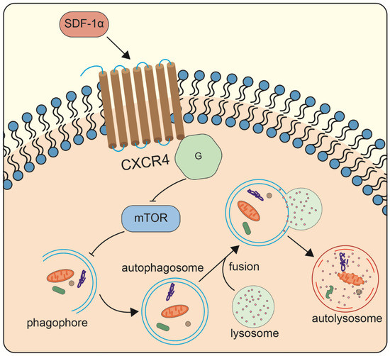 Diagrammatic sketch showing how SDF-1α mediates autophagy in chondrocytes. SDF-1 activates the subsequent cytoplasmic signals by binding to CXCR4 on the chondrocyte membrane. These signals enter the chondrocytes then inhibit the phosphorylation of the mTOR signaling, and ultimately upregulate the autophagy occurrence.