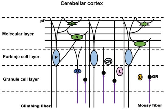 - Cerminara, N.L.; Lang, E.J.; Sillitoe, R.V.; Apps, R. Redefining the Cerebellar Cortex as an Assembly of Non-Uniform Purkinje Cell Microcircuits. Nat. Rev. Neurosci. 2015, 16, 79–93. [Google Scholar] [CrossRef]