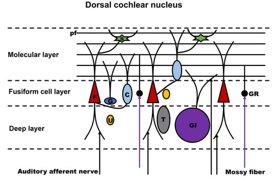 A schematic diagram of DCN three-laminar structure is illustrated (Figure 2). The molecular layer is mainly made up of the apical dendrites of fusiform cells, spine-covered dendrites of cartwheel cells, and parallel fibers [1,2,3,4,5,32,33,34]. The fusiform cell layer consists of the cell bodies of fusiform cells and cartwheel cells. The inferior colliculus, a relay nucleus in the auditory pathway, receives axons from the fusiform cells as the projection neurons of the DCN. Through parallel fibers that are generated from the axons of the granule cells, the fusiform cells receive auditory input on their basal dendrites and non-auditory input on their apical dendrites. Cartwheel cells, which are glycinergic and inhibit the efferent fusiform cells, are the type of cell that most resembles Purkinje cells. The cell bodies of cartwheel cells can be found near the molecular layer and fusiform cell layer boundaries in both layers, but their dendrites are mainly restricted in the molecular layer. The parallel fibers in DCN are produced by the granule cells, and they are not organized as granule cell layers in the DCN, but their function is comparable to cerebellar granule cells. The granule cells of DCN manifest as granule cell masses and mostly reside in the fusiform cell layer. Granule cells receive complex mossy fiber input from many brain nuclei, vestibular afferents, type II auditory nerve fibers, the inferior colliculus and auditory cortex [1,2,3,4,5,32,33,34]. The deep layer of DCN underneath the fusiform cell layer is the deepest and most polymorphic layer. The dendrites of fusiform cells and giant cells that receive input from the auditory nerve make up this layer. This layer also contains the cell bodies of giant cells and a large number of interneurons, e.g., Golgi cells and tuberculoventral cells. The deep layer of the DCN, which resembles the third layer of the cerebellar cortex, also contains unipolar brush cells. The layer structure, cell types, and local circuits of the DCN and cerebellum are all described above as having many similarities. Granule cells, Golgi cells, unipolar brush cells, and stellate cells, which are among the cell types, as well as the molecular layers with parallel fibers, are present in both structures [1,2,3,4,5,32,33,34,35].