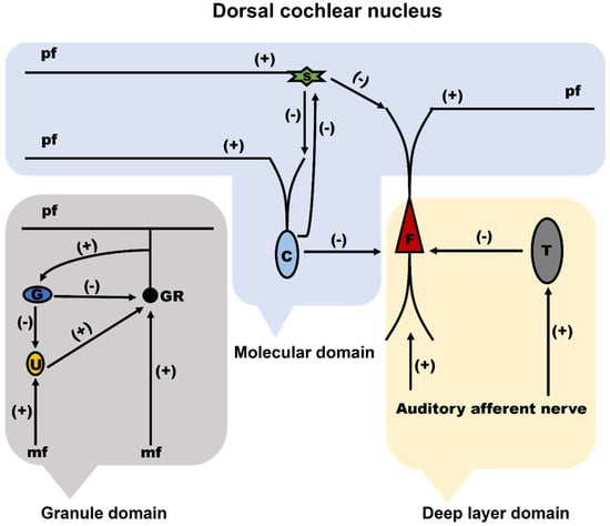 - Trussell, L.O.; Oertel, D. Microcircuits of the Dorsal Cochlear Nucleus. In The Mammalian Auditory Pathways; Oliver, D.L., Cant, N.B., Fay, R.R., Popper, A.N., Eds.; Springer: Cham, Switzerland, 2018; Volume 65, pp. 73–99. [Google Scholar]